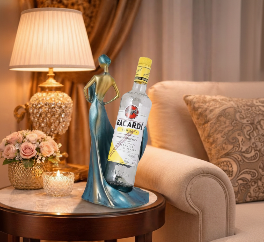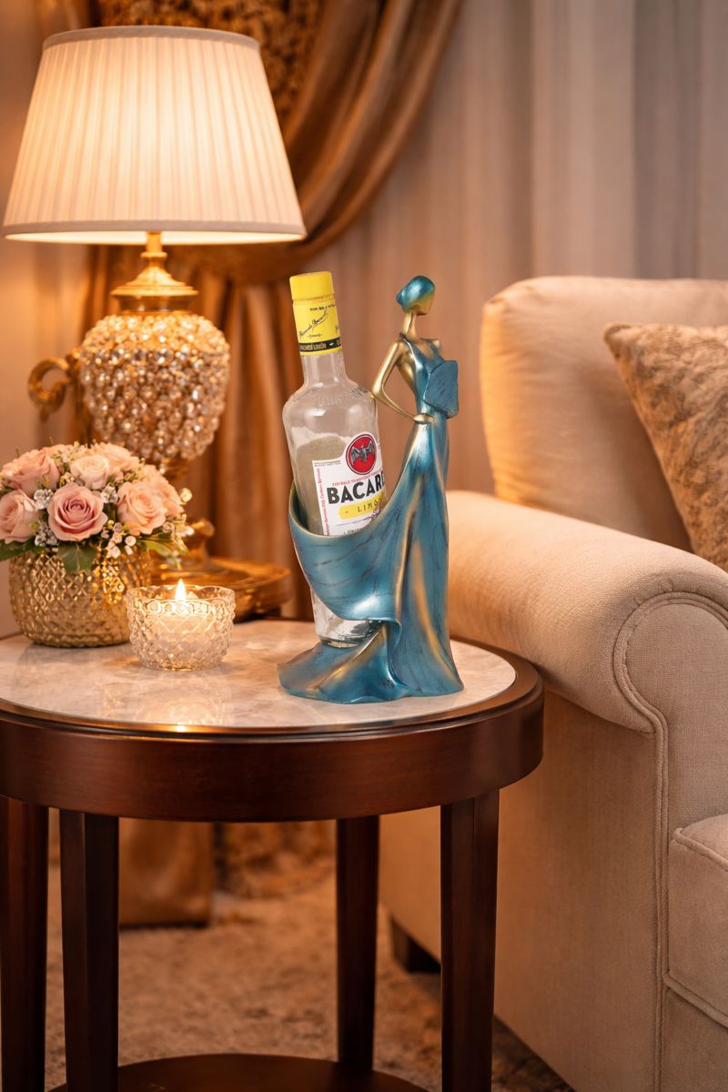 Add a touch of luxury and artistic elegance to your living space with this Elegant Lady Wine Bottle Holder Showpiece. Crafted with a modern abstract design, this premium decor piece beautifully blends functionality with aesthetics. The graceful metallic female figurine holds a wine or liquor bottle seamlessly, transforming it into a striking decor statement rather than just a utility item.