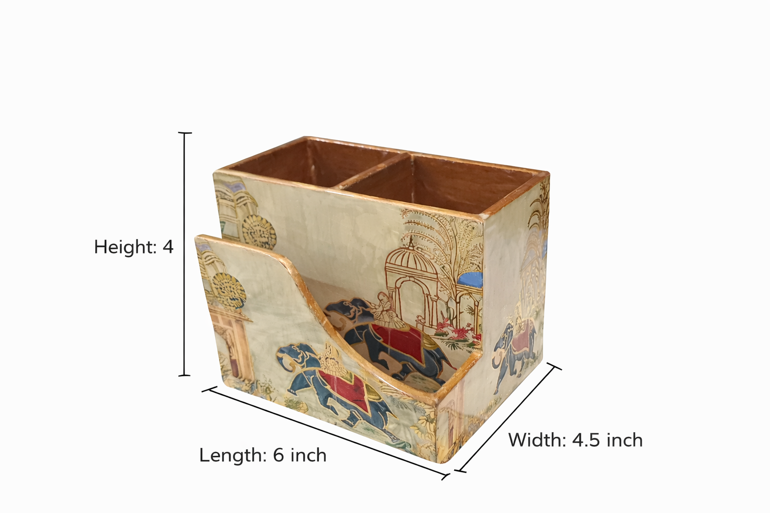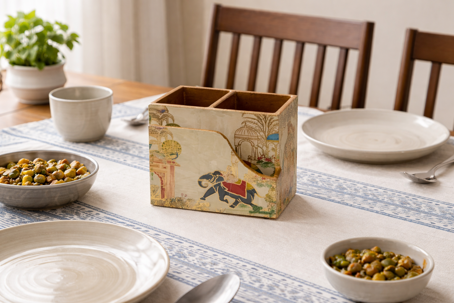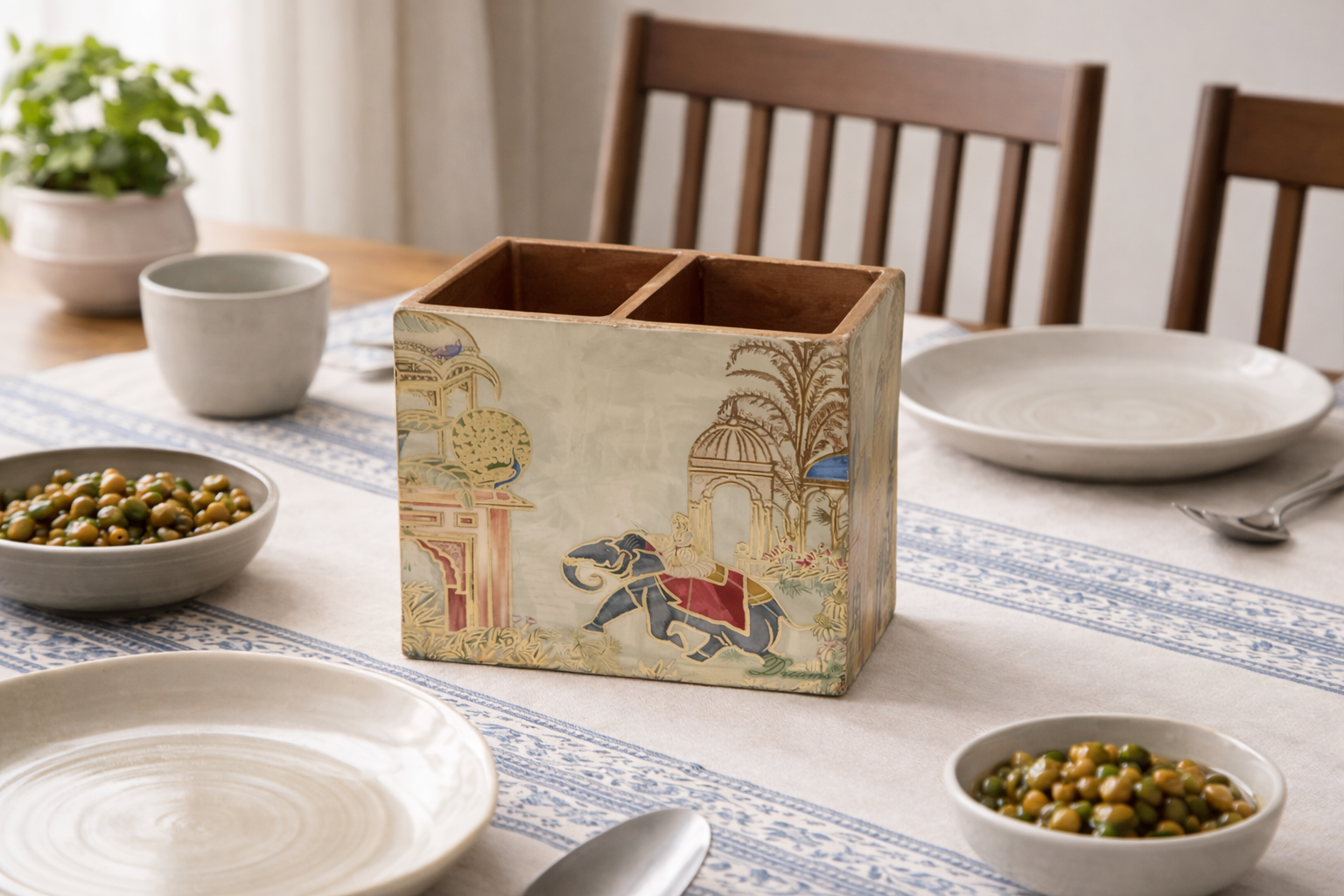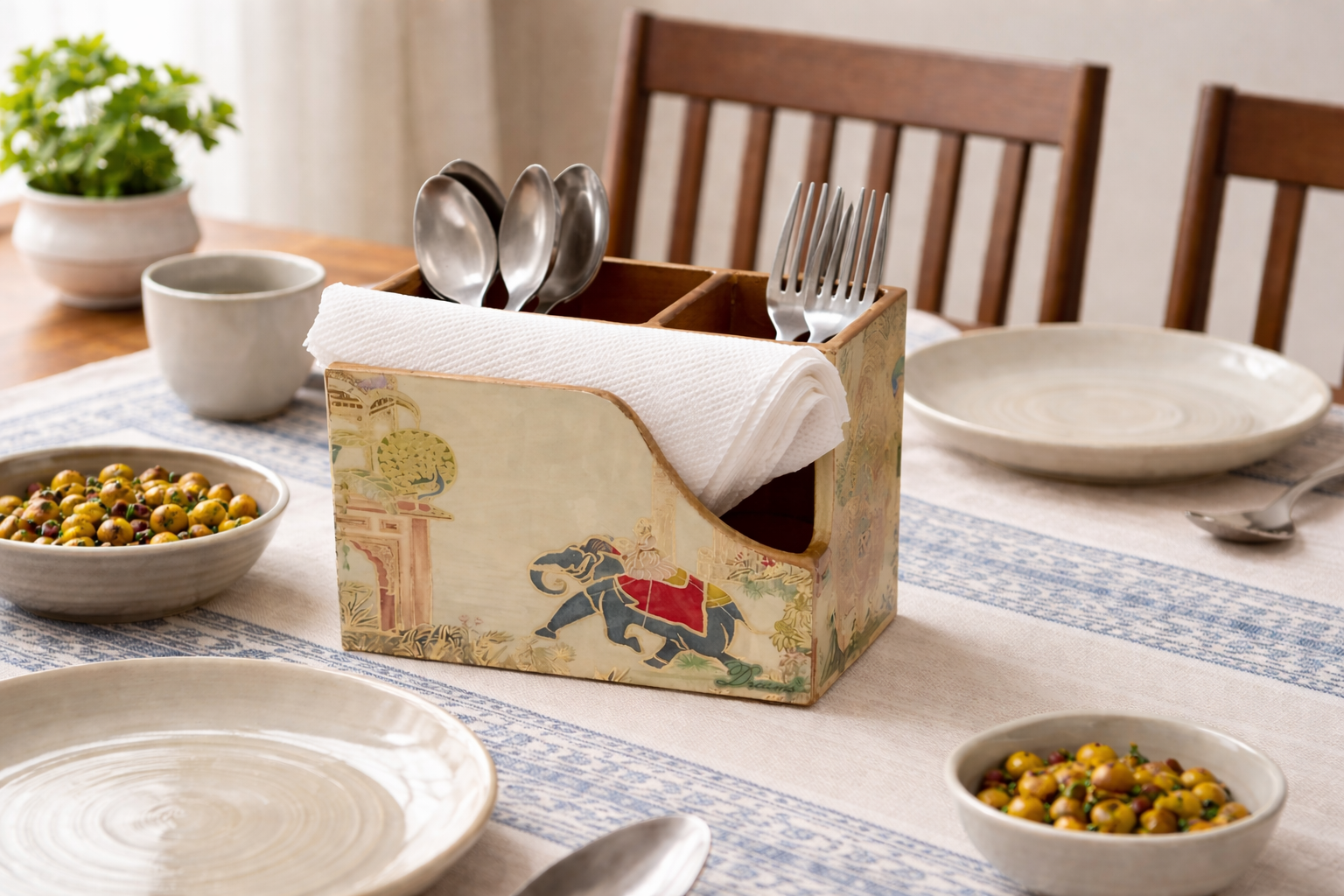 Bring together functionality and traditional charm with this Hand-Painted Wooden Cutlery & Napkin Holder, thoughtfully designed for modern Indian dining spaces. Crafted from durable wood and adorned with intricate artwork inspired by classic Indian motifs, this organizer adds character to your table while keeping essentials neatly arranged.