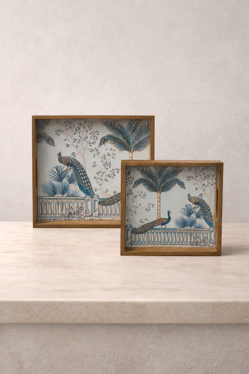 Enhance your home décor with this elegant Peacock Design Wooden Tray Set, crafted to bring art, color, and sophistication to any space. Each tray features a detailed peacock illustration paired with botanical elements, making it perfect for both serving and display.