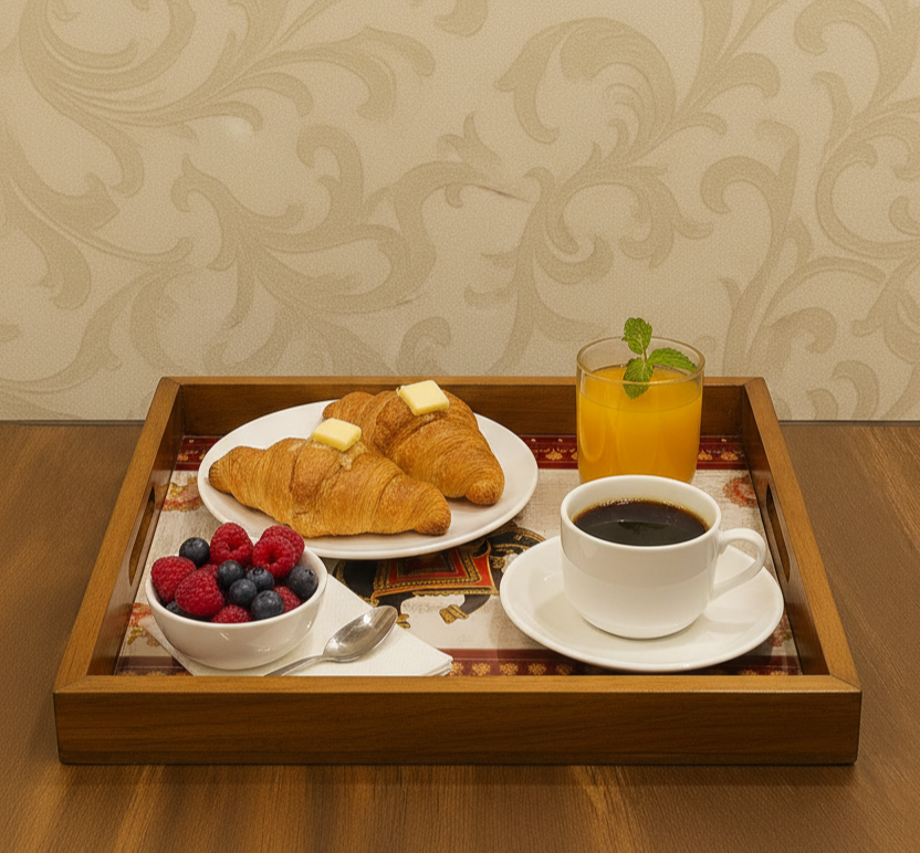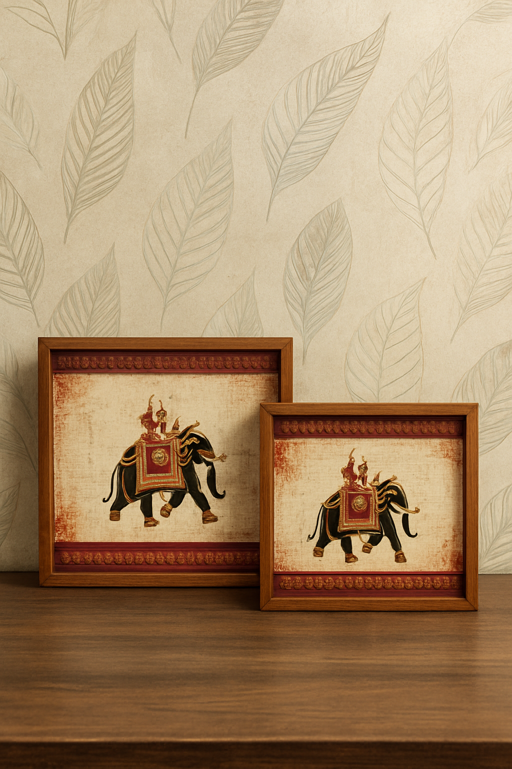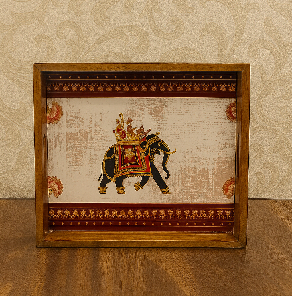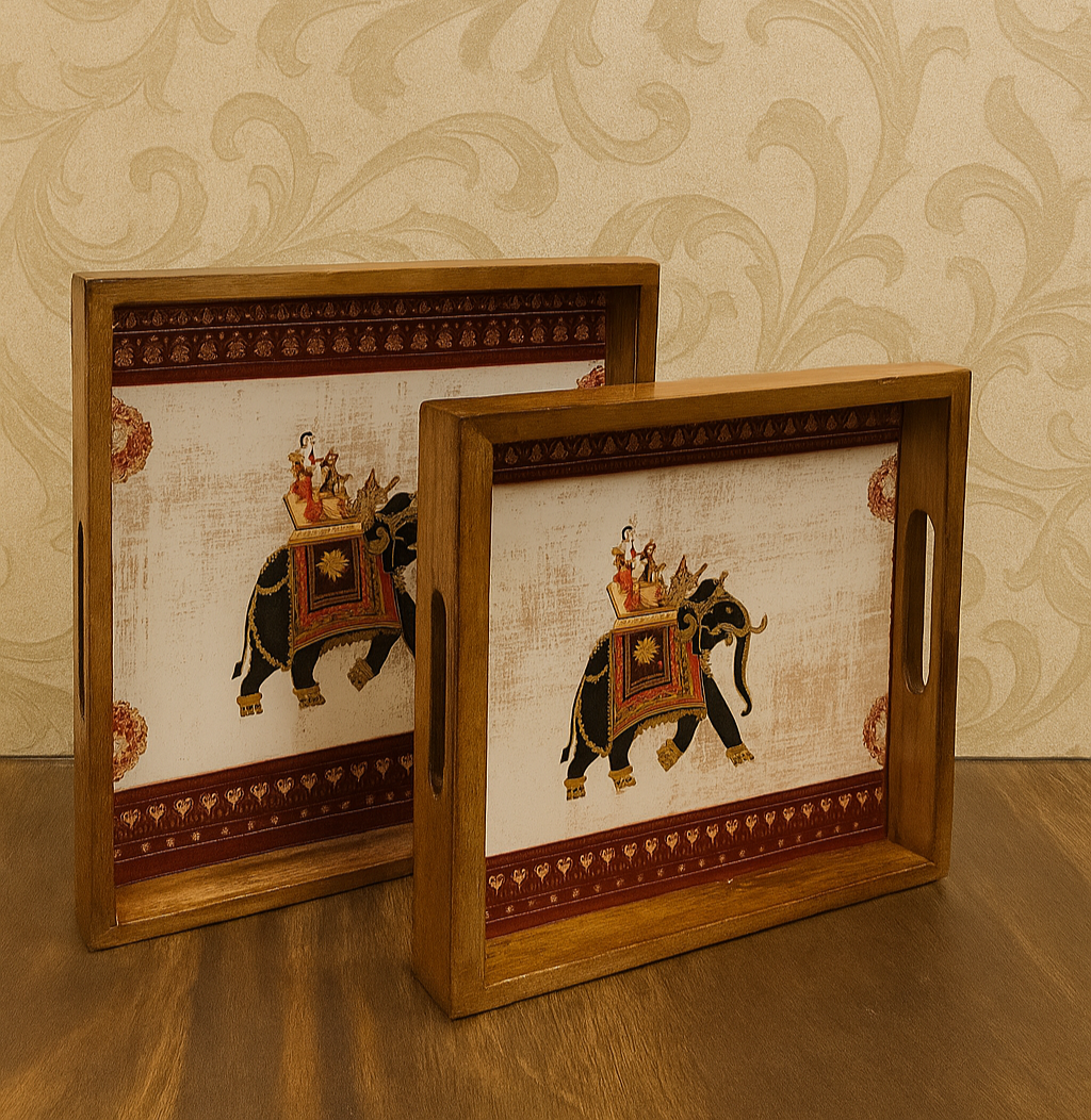 Elevate your home decor with this exquisite Set of 2 Decorative Serving Trays, featuring a majestic Mughal-style elephant procession print. Inspired by the rich traditions of Indian miniature art, these handicraft trays are perfect for adding a royal, ethnic touch to any space.